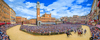 Running of the Palio di Provenzano Horse race - Carabinieri Policia ceremonial charge with sabers drawn before start of the race - Siena, Italy 2024